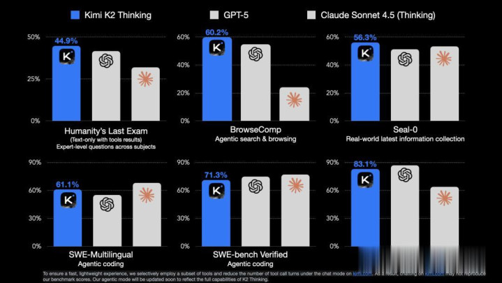 Kimi K2 Thinking与GPT-5、Claude Sonnet 4.5在多项基准测试中的表现