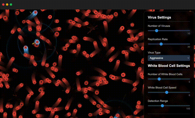 红蓝两种粒子在屏幕上相互追逐、碰撞、吞噬。拖动滑块,就能调整病毒复制率、免疫细胞数量。