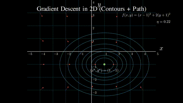 蓝色的等高线越靠近中心,函数值越小;黄色的路径是优化算法从起点到最优点的下降轨迹;红色小箭头表示梯度(∇f)的方向;黄色点表示当前的模型参数位置,它沿着梯度的反方向移动。