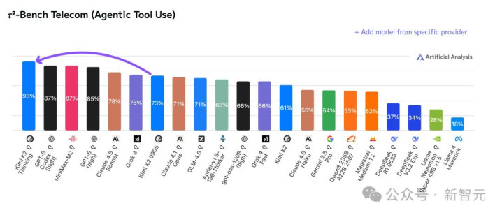 在Tau2 Bench Telecom基准测试中,K2 Thinking位列第一。